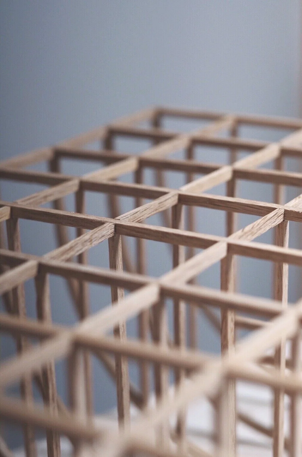Struktur is the beginning of a series of architectural lights that highlight transparent structure and process in a form that allows you visual access both inside and out. The light sculpture is crafted using curving steam bent oak and Kalkepapir. A transparent architect-like structure it plays with the projection of shadows and light.